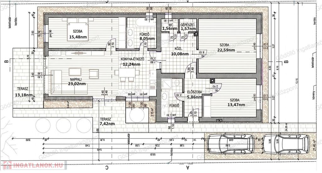 Elosztása: előszoba, tolóajtós nappali-konyha-étkező, közlekedő, 3 tágas szoba, egy kádas és egy zuhanyzós fürdőszoba, két mellékhelyiség, gépészet + 26nm terasz.